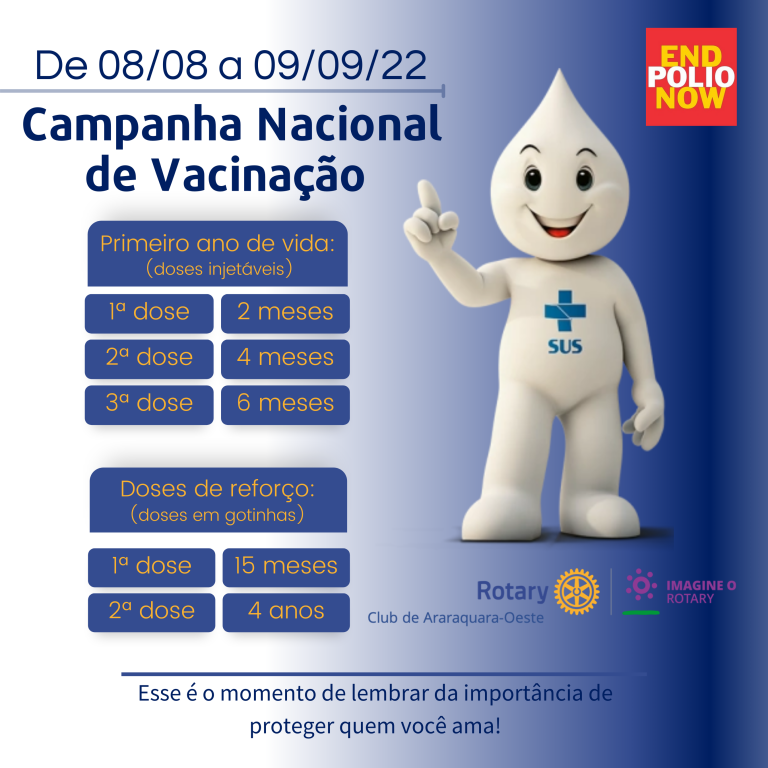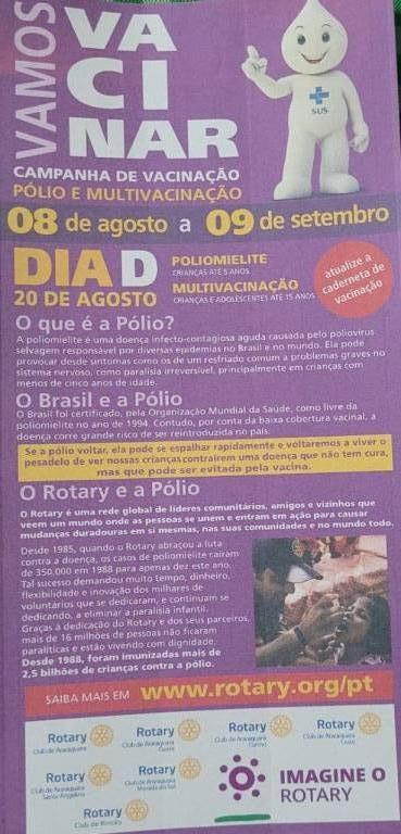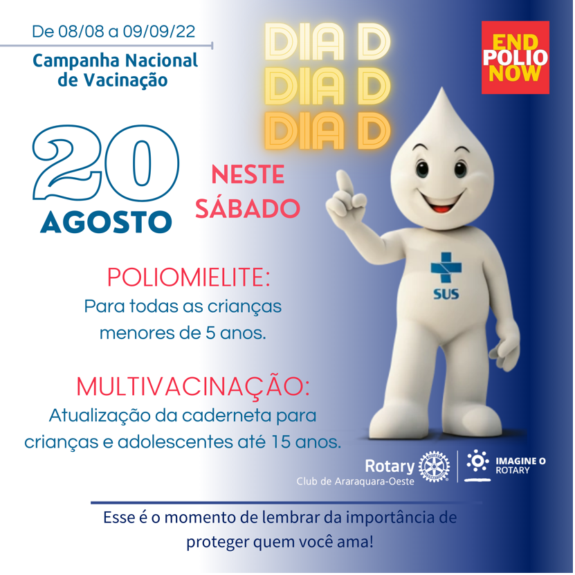 No dia 20 de agosto de 2022, o Rotary Club de Araraquara-Oeste participou da Campanha Nacional do “DIA D” de Vacinação contra a poliomielite e atualização da carteirinha de multivacinação.A ação foi realizada, das 7h30 às 17h30, na sede do Serviço Especial de Saúde de Araraquara (Sesa), que fica na Rua Itália, 1617, no Centro.